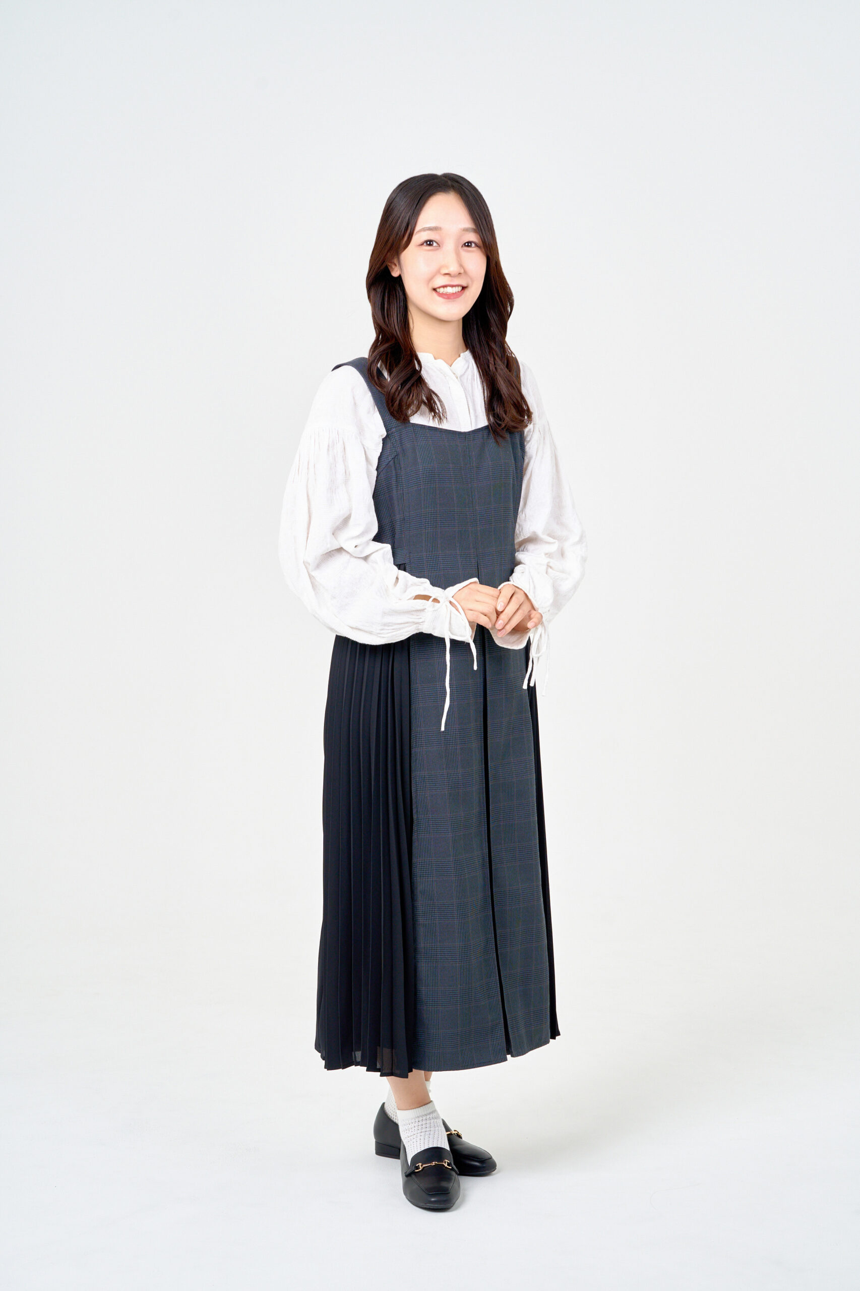 宣材写真の撮影です。白背景のシンプルな構成で、ナチュラルな表情と優しい雰囲気に仕上げています。その方の魅力を最大限に引き出すよう心がけます。