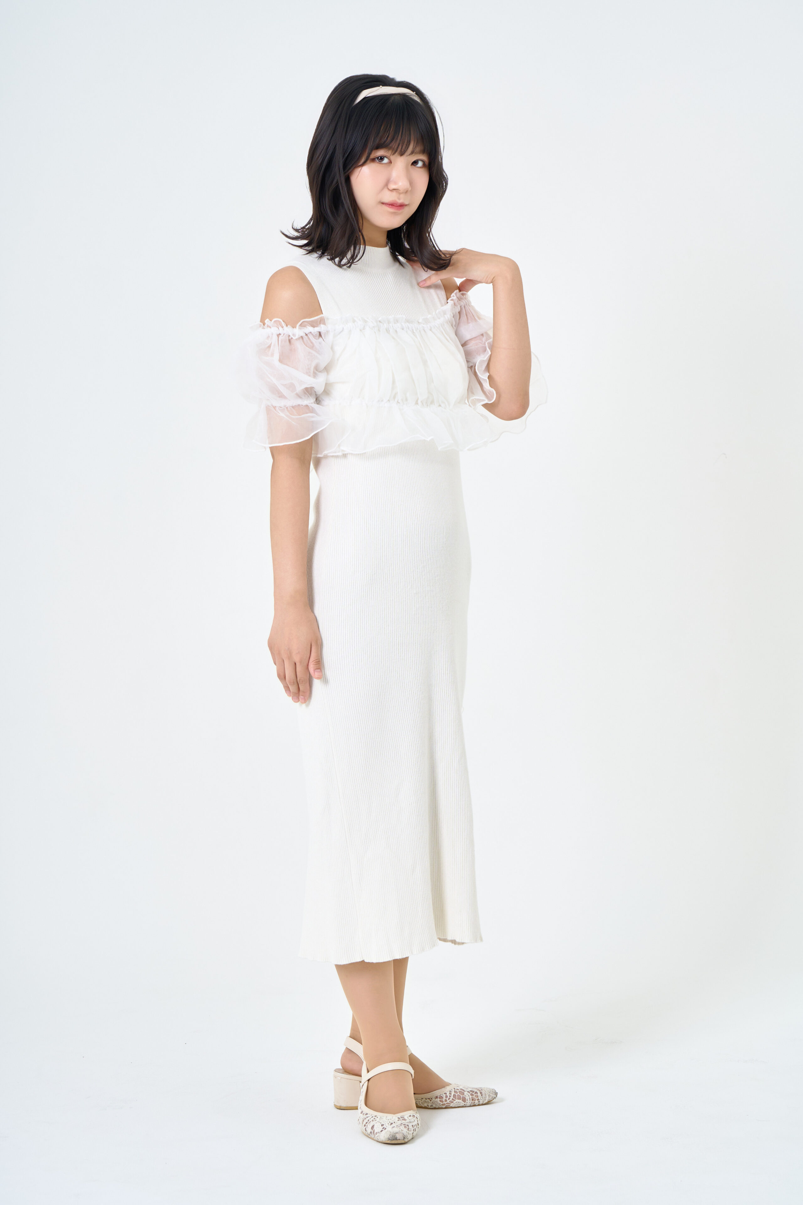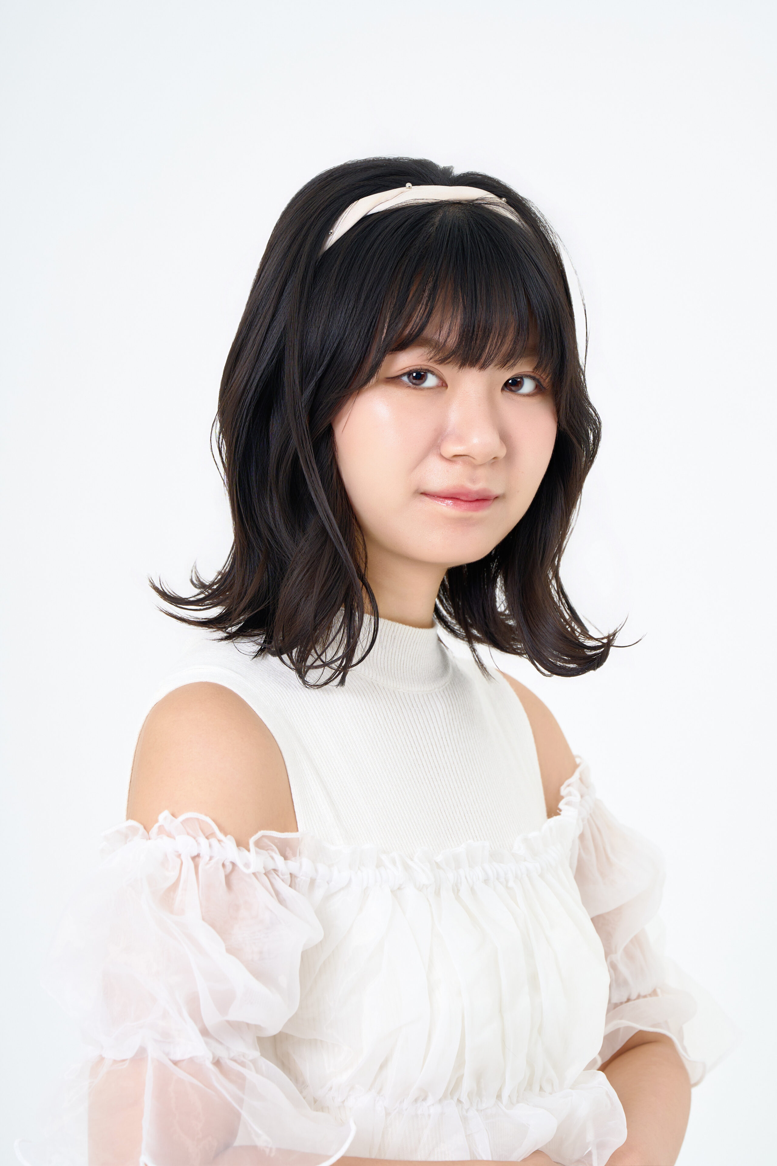 宣材写真の撮影です。可愛らしさをコンセプトに、白背景で丁寧にライティングを施しました。ポージングはシンプルに整え、本人らしさがしっかり伝わる一枚に仕上げています。