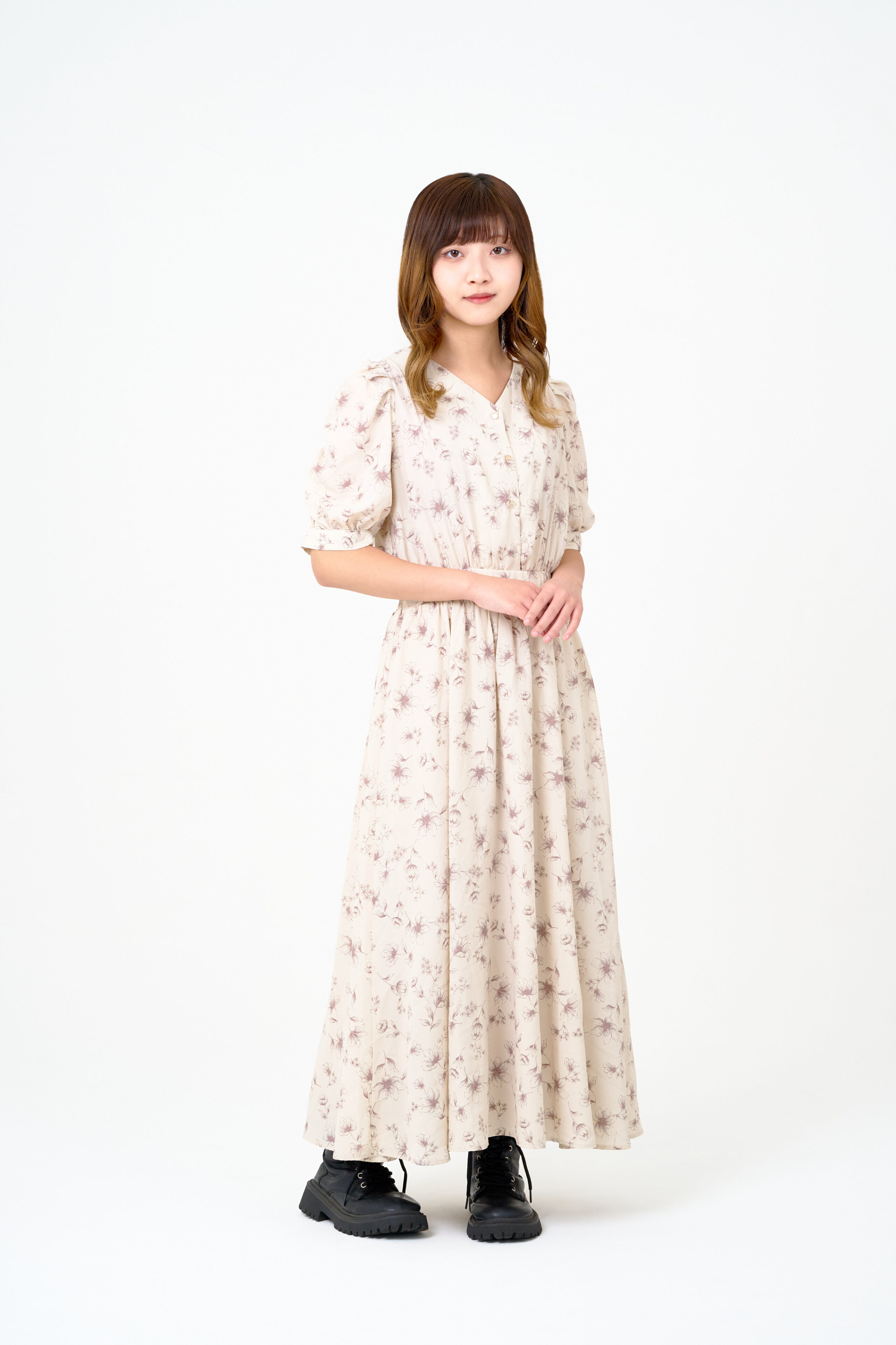 宣材写真の撮影です。白背景のシンプルな構成で、明るさと優しさが際立つ写真に仕上げています。アンニュイな表情とリラックスした雰囲気で、魅力を最大限に引き出しています。