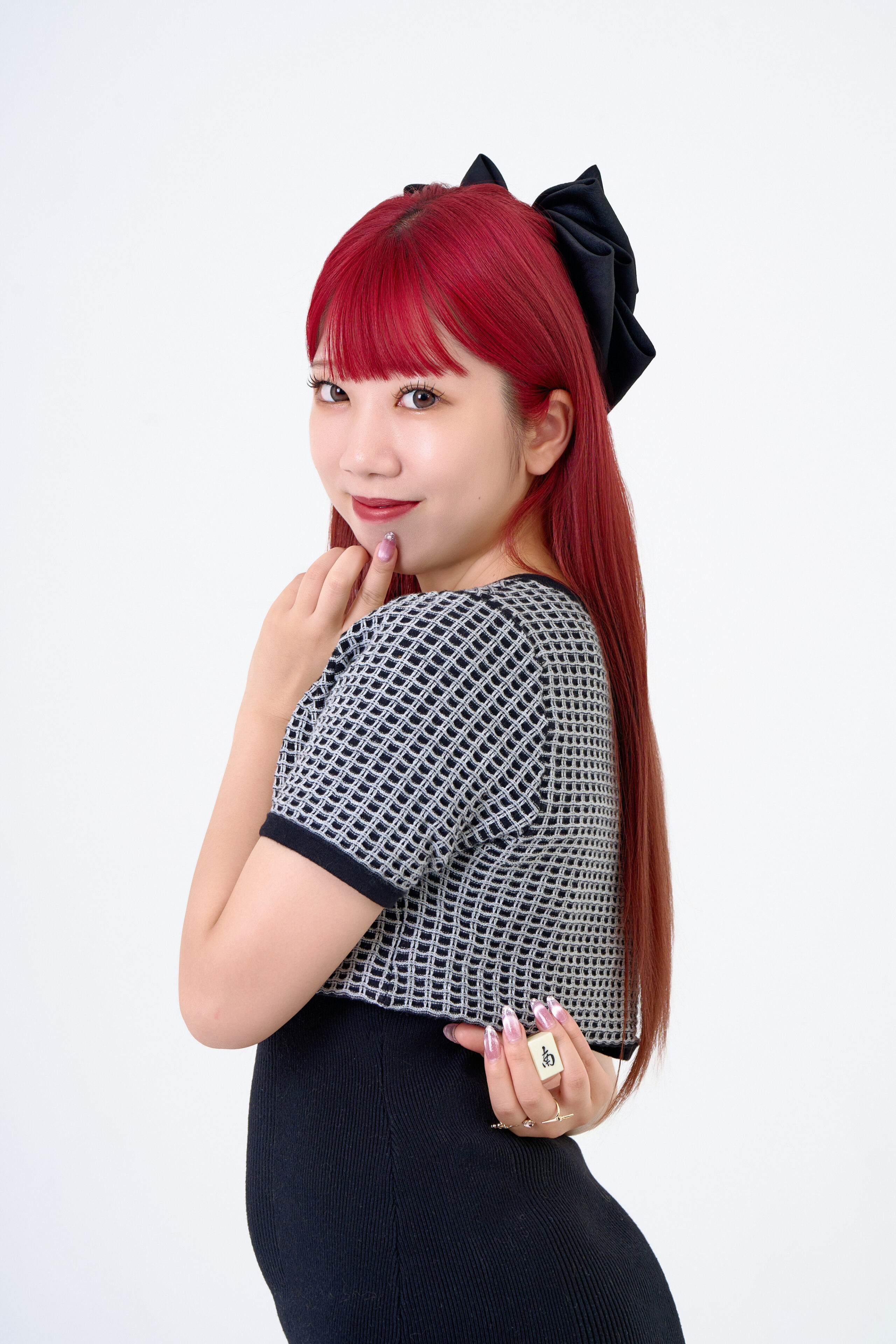 プロ雀士の方の宣材写真の撮影です。小道具の麻雀牌を使い、いろんな雰囲気のポージングを提案させていただきました。白背景で丁寧にライティングを施しました。艶っぽさを感じさせる雰囲気も演出し、洗練された一枚に仕上げています。