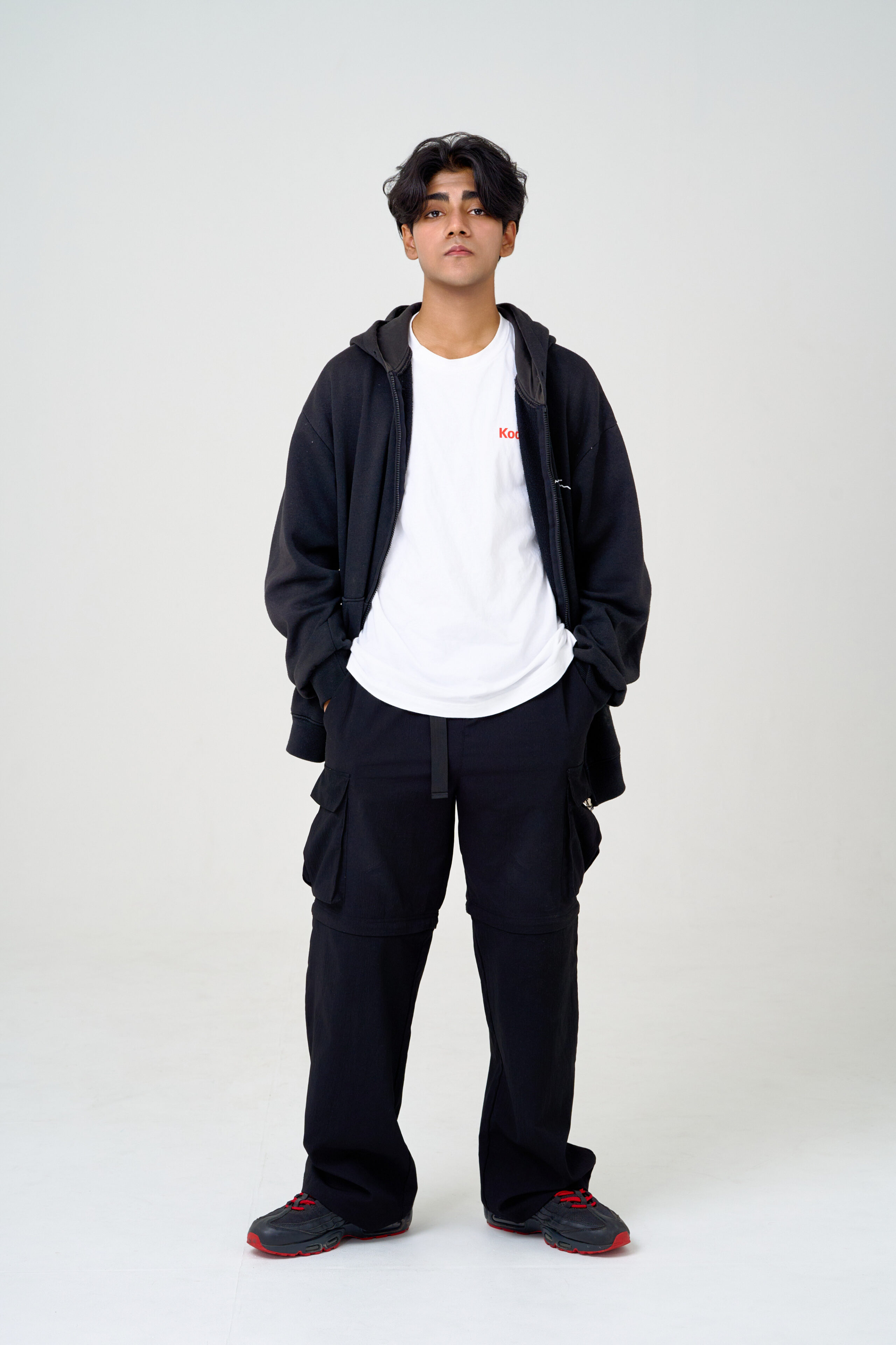 宣材写真の撮影です。クールな印象を大切にしながら、グレー調のライティングはご本人の人柄や衣装に合わせて調整しました。アンニュイな印象も取り入れ、洗練された魅力が引き立つ一枚に仕上げています。