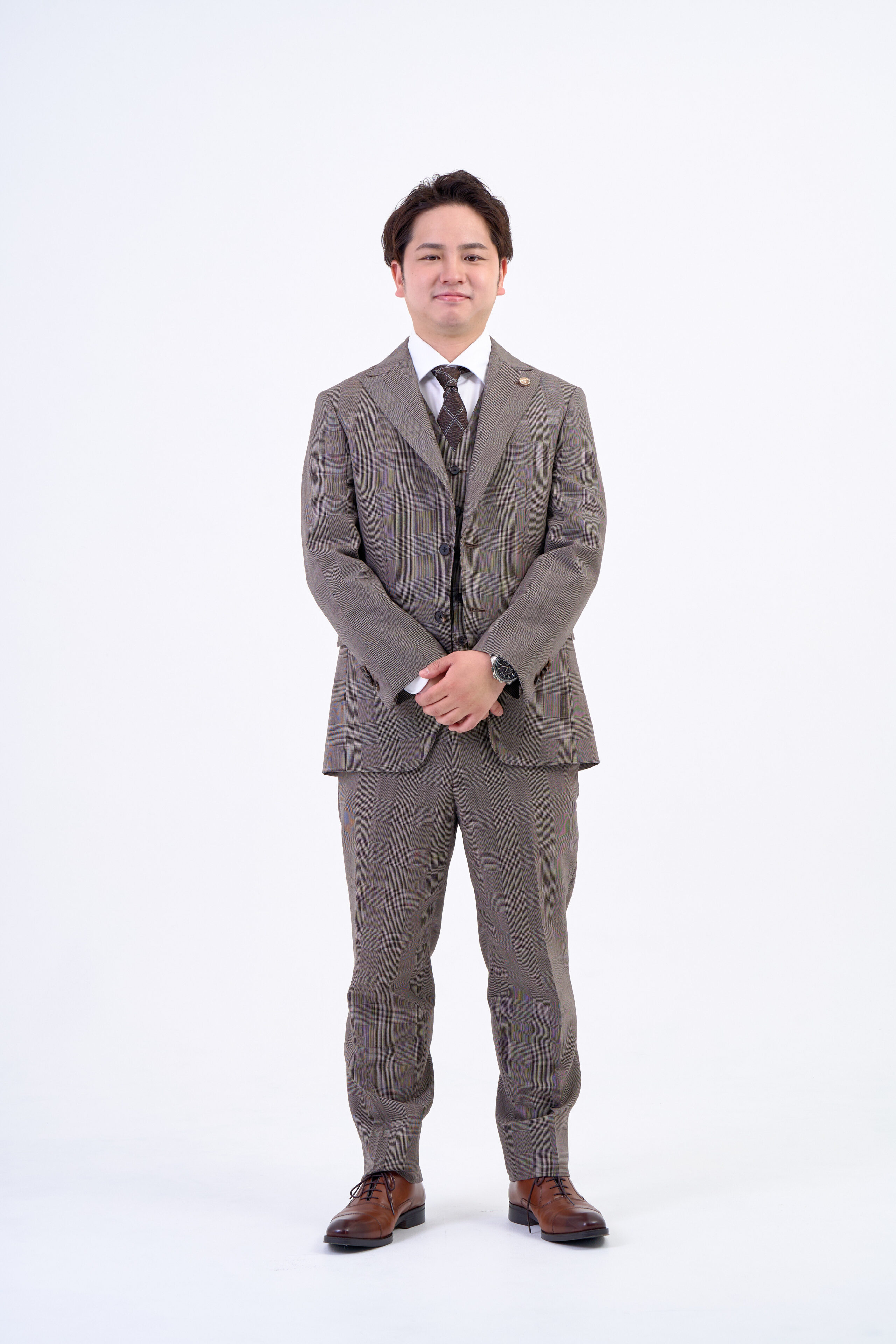 ヘアメイクは肌のトーンを明るく整え、ナチュラルな雰囲気に。前髪を立ち上げて男らしさを強調し、清潔感のあるさわやかな印象に仕上げました。