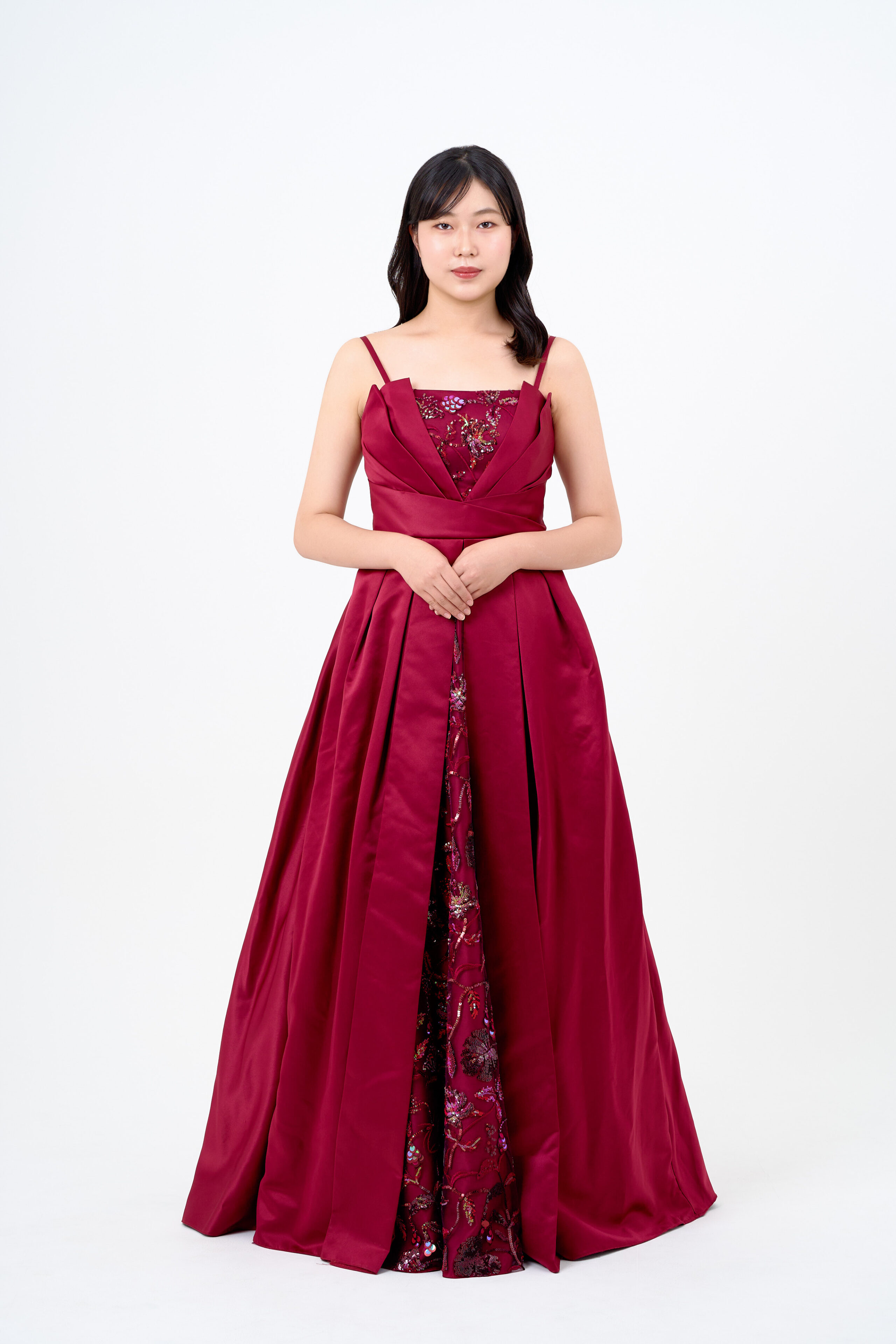 肌なじみの良い血色感のあるメイクを施しました。衣装とのコントラストを意識し、全体を華やかにまとめています。ヘアは洗練された印象になるよう、毛先をワンカールに整えました。
