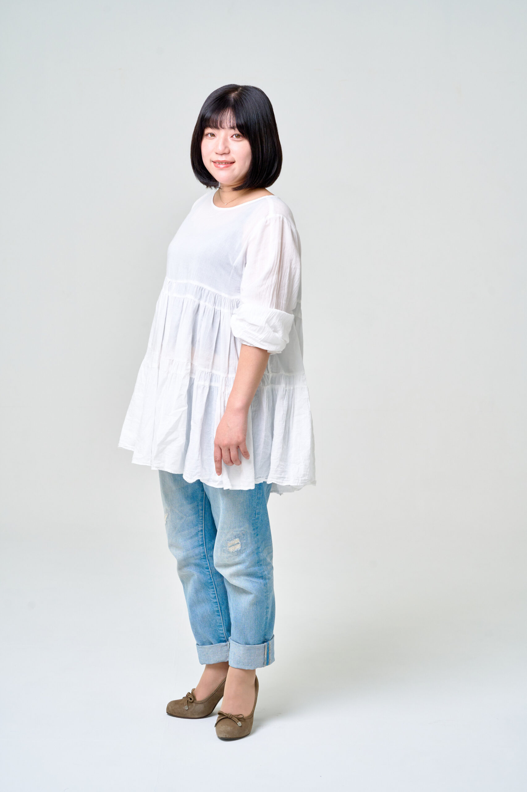 リップやチークは全体の雰囲気に合わせて統一感のある色味でまとめ、涙袋など立体感を意識したメイクで柔らかい表情を演出しました。ヘアは前髪をシースルーでセットし、顔まわりが明るく見えるよう仕上げています。