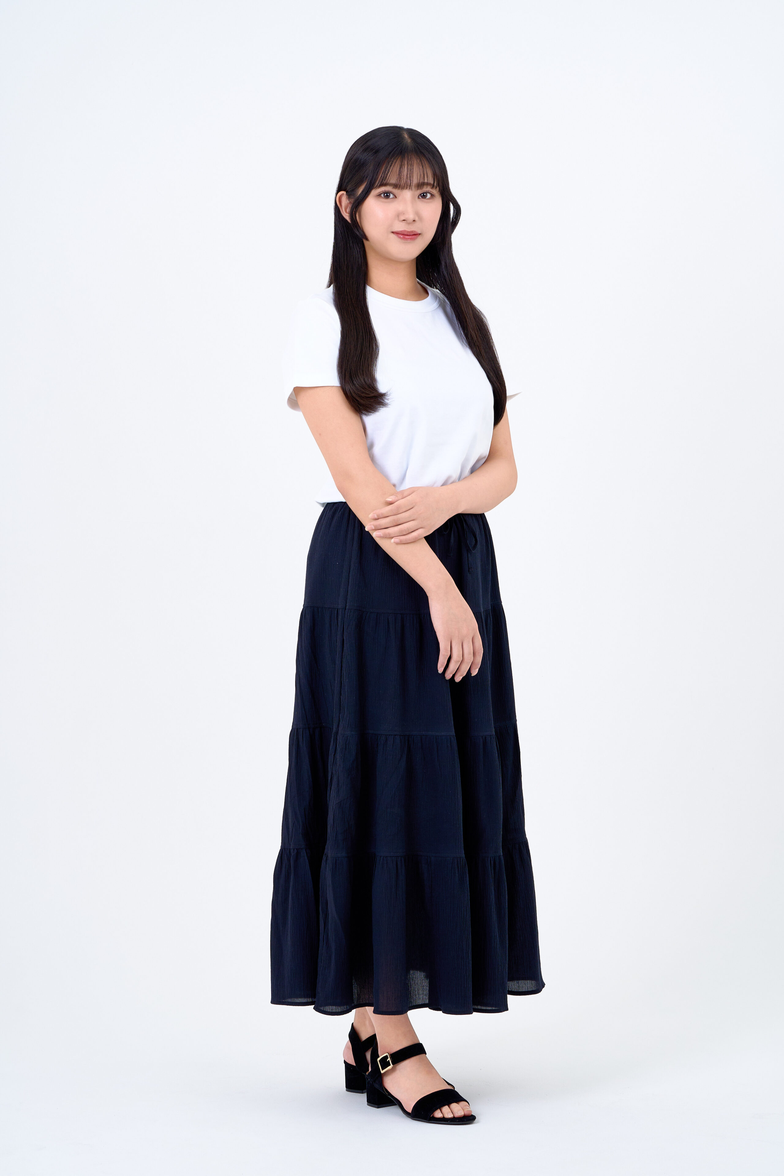 落ち着きのあるダークカラーで統一したアイメイクには、肌トーンに合わせたチークと唇の色に合わせたリップで自然な血色感をプラス。印象的なロングヘアは軽く内巻きにし、全体的にナチュラルで凛とした雰囲気に仕上げました。