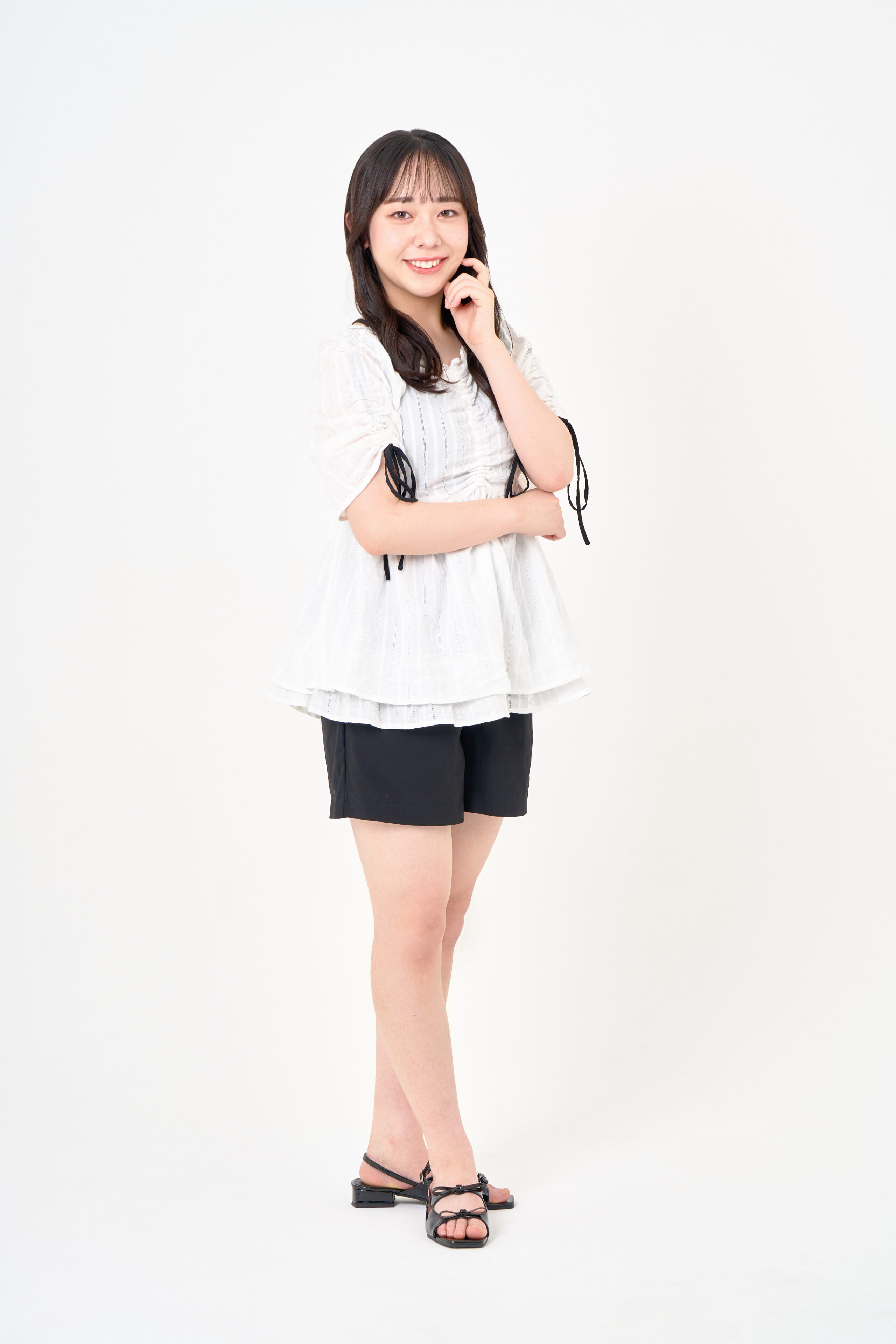 プロフィール写真の撮影です。可愛らしい雰囲気を目指し、フレッシュなライティングを使用しました。ご本人の魅力を引き出すために、手先を意識したポージングをご提案し、自然体でありながら印象的な一枚に仕上げています。