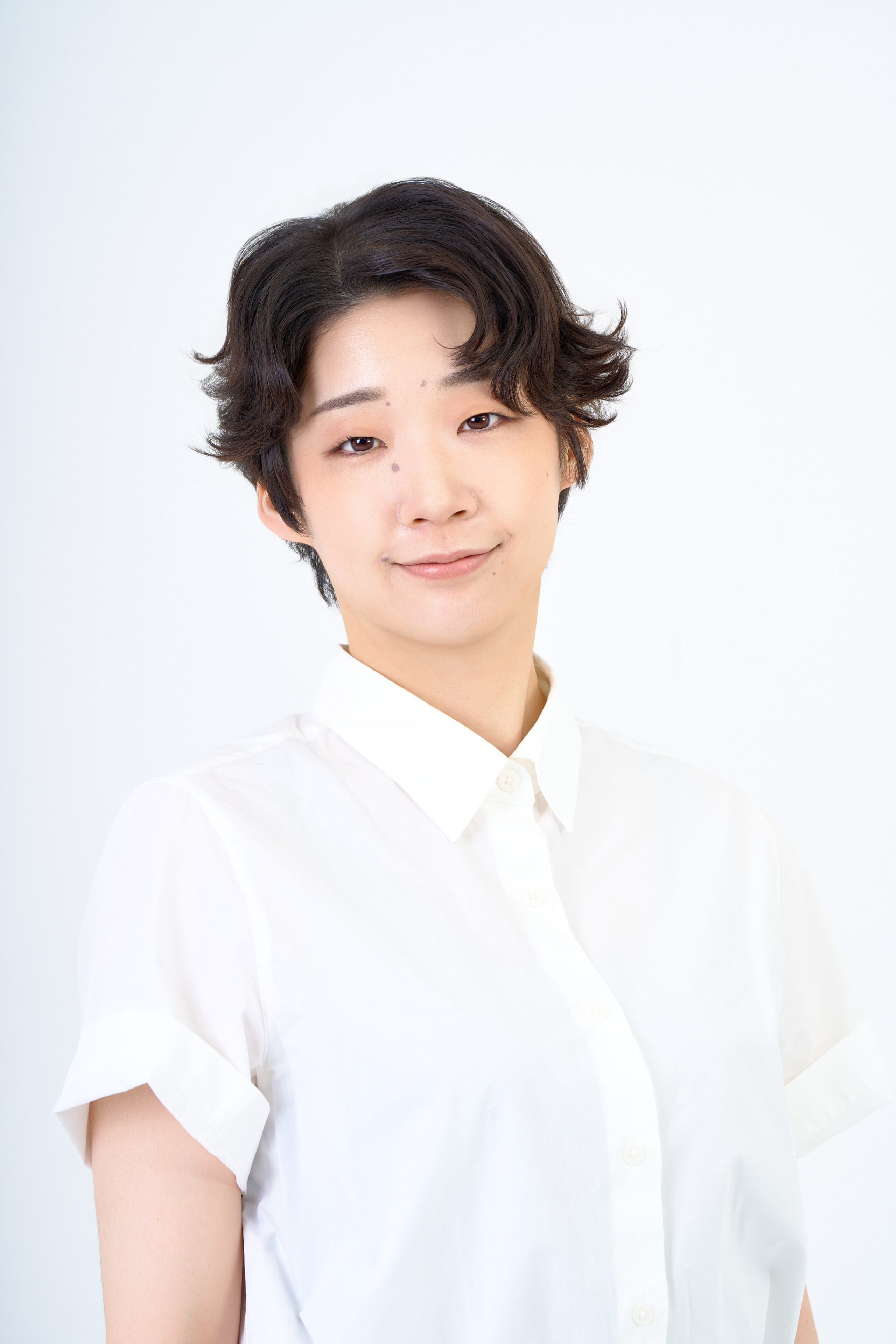声優関係の方の宣材写真の撮影です。シンプルなライティングで明るい笑顔が際立ち、ボーイッシュな雰囲気を表現しました。細やかな調整を重ねながら、その方の魅力を最大限に引き出しています。