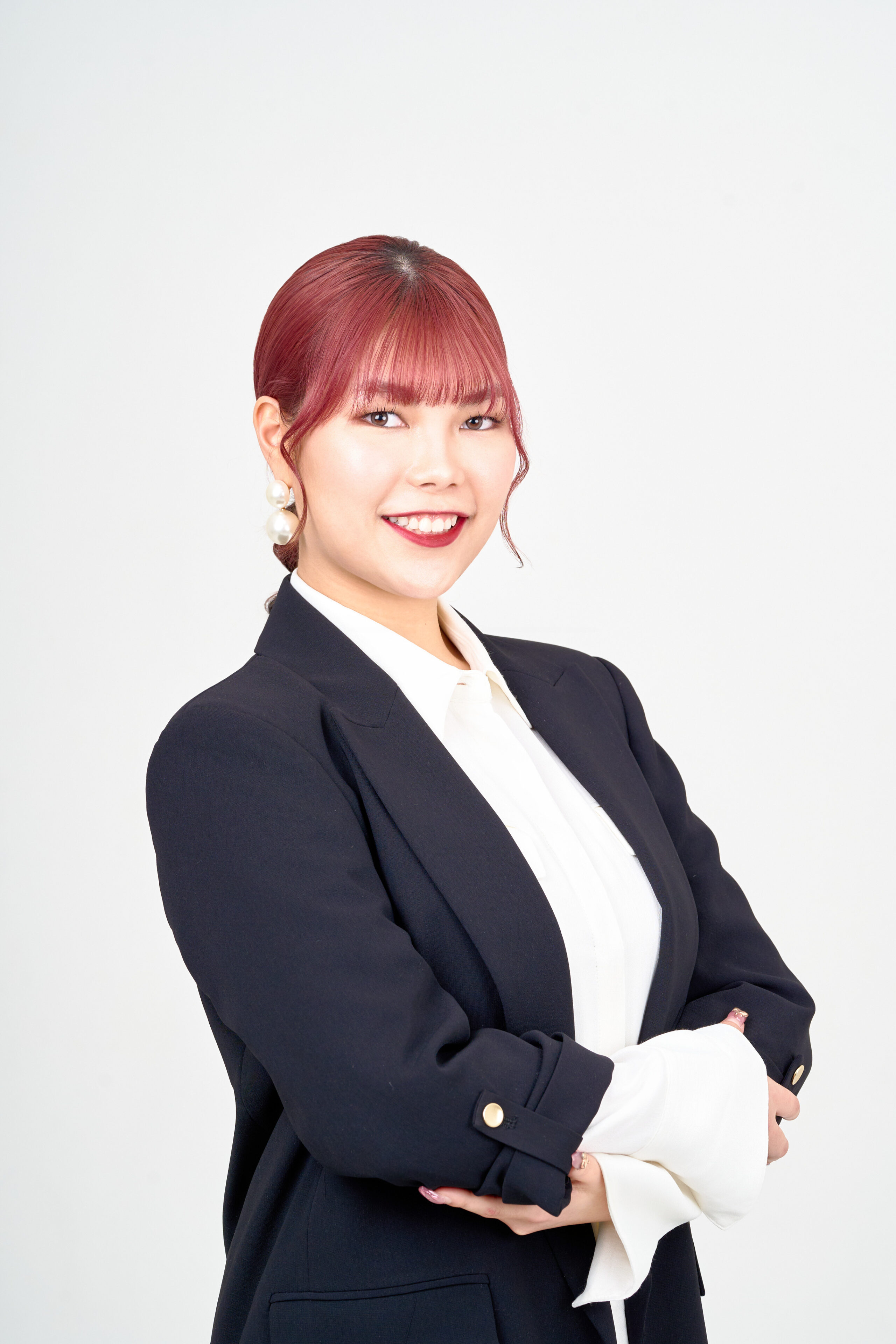 髪色や衣装に合わせて、前髪や顔周りの毛にゆるやかな曲線を持たすことで、お顔の印象をより引き立て、凛とした雰囲気を作りました。